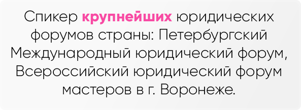 - Спикер крупнейших юридических форумов страны: Петербургский Международный юридический форум, Всероссийский юридический форум мастеров в г. Воронеже.